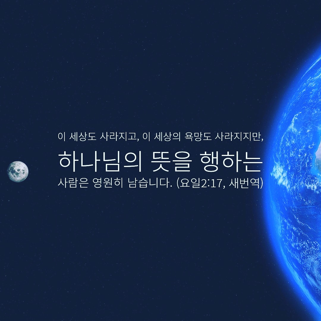 이 세상도 사라지고, 이 세상의 욕망도 사라지지만, 하나님의 뜻을 행하는 사람은 영원히 남습니다. (요일2:17, 새번역)